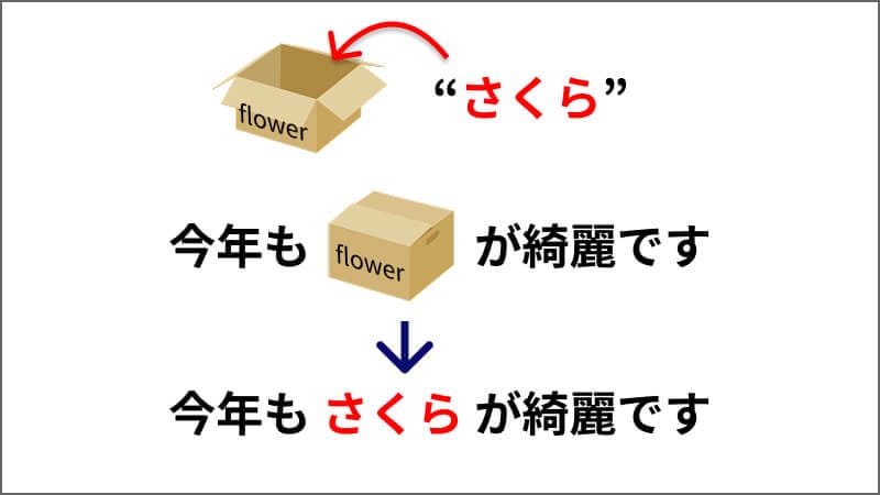 つまり、あとから flower を使えば、毎回 “さくら” と書かなくてもよくなります。