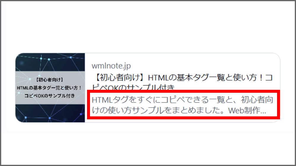 SNSでWebページがシェアされたときに表示される「説明文(ディスクリプション)」を決めるタグです。
