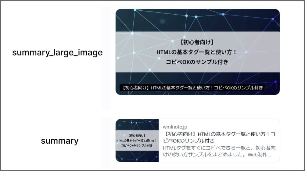 | summary_large_image | 大きな横長画像で目立つカード。ブログや商品紹介などにおすすめ。 |