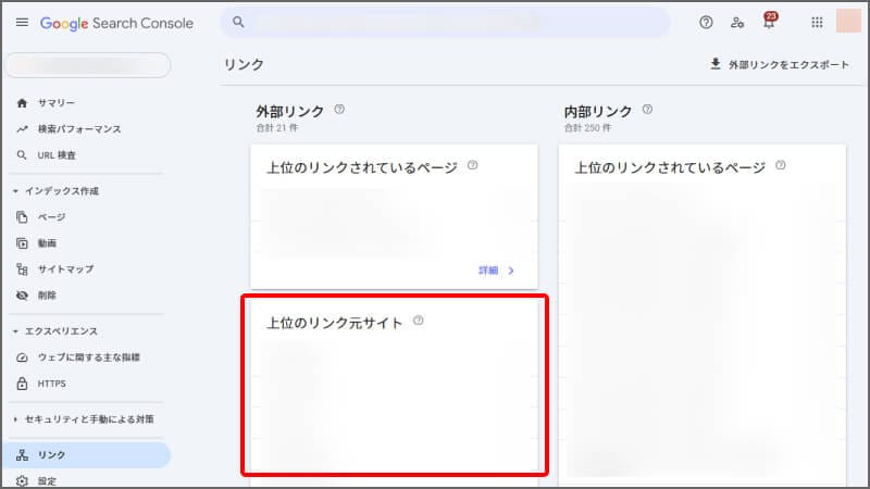 「上位のリンク元サイト」から不審なドメインや大量のリンクが見つかればスパムリンクの可能性があります。