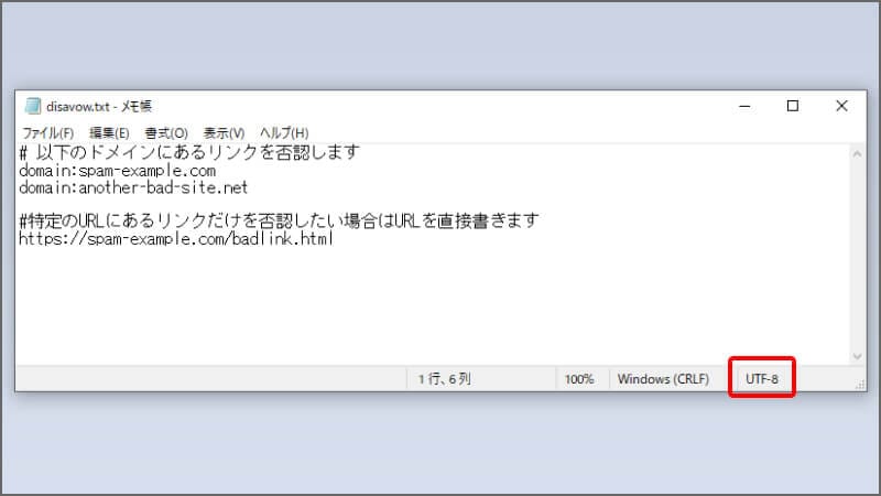 ファイル名は何でもOKなので、分かりやすい名前にしておきましょう。(例:disavow.txt)