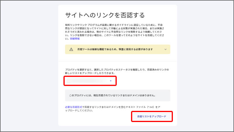 否認ツールにアクセスして、スパムリンクを受けているサイトのドメインを選択し、作成した.txtファイルをアップロードします。